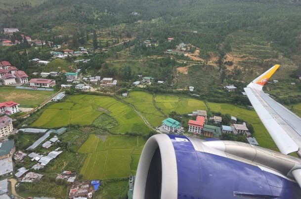 The descent cuts sharply between jagged Himalayan ridges, the plane weaving like a hawk through narrow valleys before dropping onto the runway, the only international airport in Bhutan.