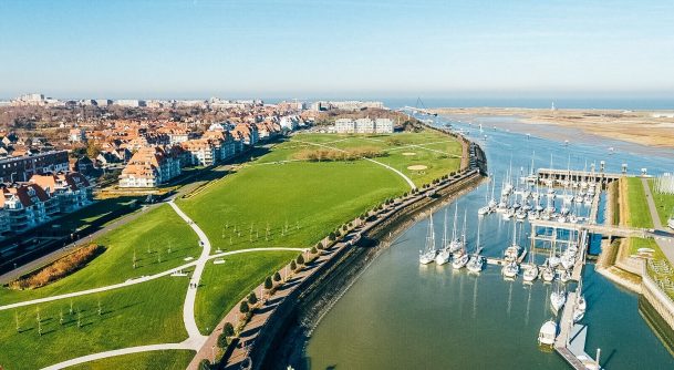The structure’s breakwaters, piles and concrete tiles are built along the Nieuwpoort Duinkerke canal (part of the Yser River), on the green edge of picturesque Veurne.