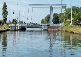 The structure’s breakwaters, piles and concrete tiles are built along the Nieuwpoort Duinkerke canal (part of the Yser River), on the green edge of picturesque Veurne.